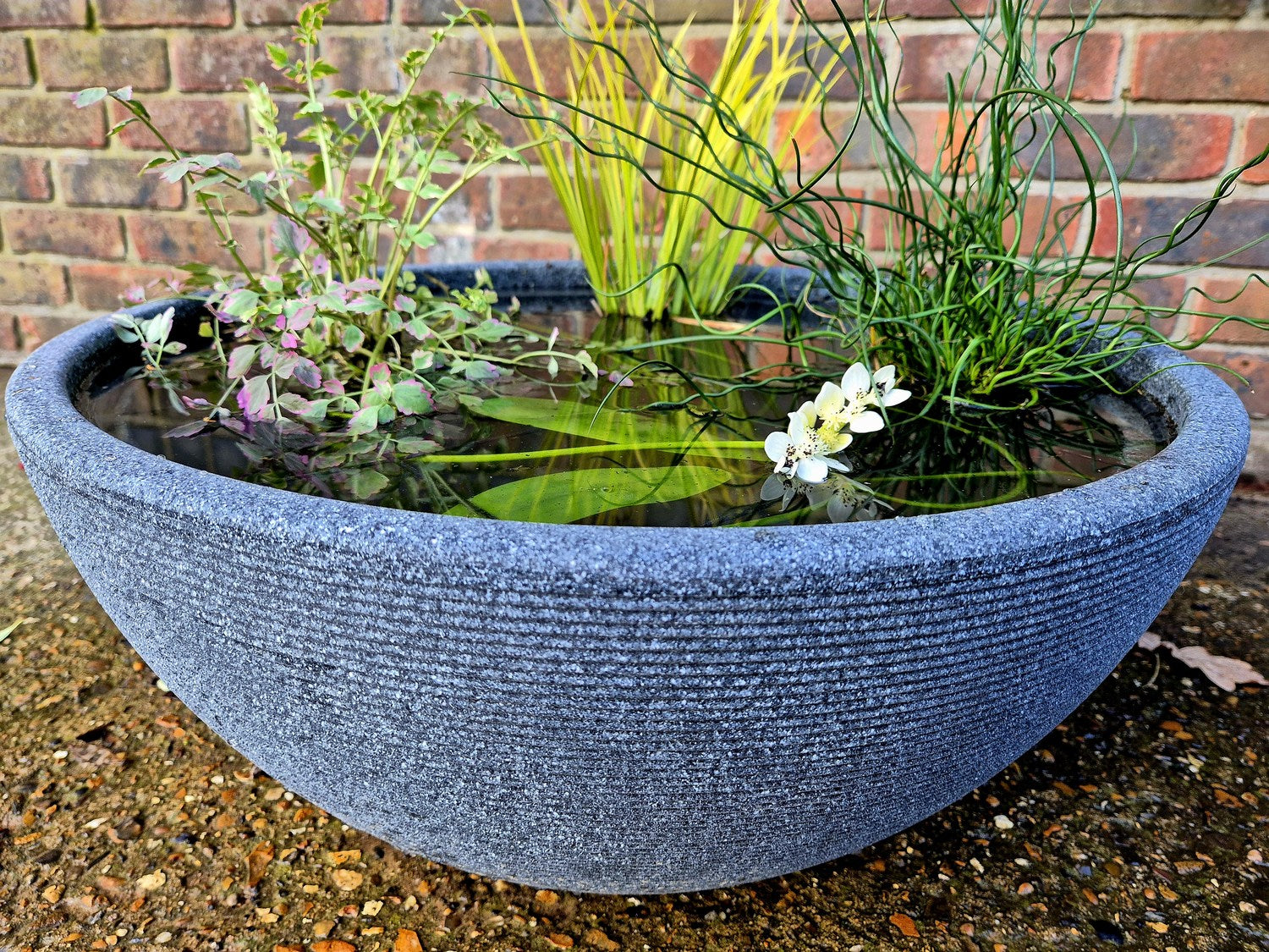 The kit includes the bowl, wire mesh frame, one 1 litre deep water plant and three 1 litre seasonal marginal and oxygenating plants. The deep water plant is usually water hawthorn or another suitable variety selected by our growers at the time of dispatch. Together, the planting creates a more complete and natural-looking miniature pond, with a pleasing balance of surface interest, vertical structure and seasonal variation.
