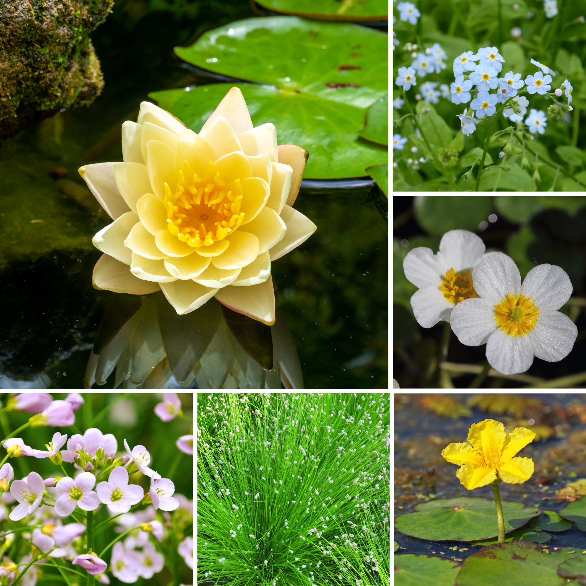 Each collection contains six plants supplied in 1 litre pots, including one deep water plant in the form of a miniature water lily. This will most commonly be Pygmaea Alba, Pygmaea Helvola or a Xiafei, depending on availability. These varieties are chosen for their compact growth habit, typically spreading around 30–50 cm, making them particularly well suited to smaller ponds and containers.
